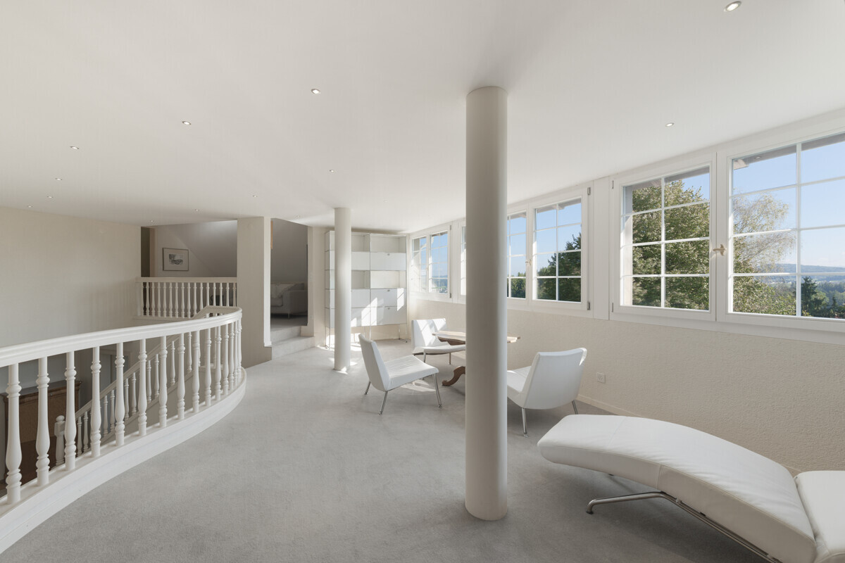 Die Villa überzeugt mit rund 350 Quadratmeter Wohnfläche, verteilt auf zehn vielseitig nutzbare Zimmer. Hochwertige Materialien, wie Naturstein und Parkett, prägen den Charakter der Räume. Die offene Galerie im Obergeschoss, die grosszügige Küche mit professioneller Ausstattung und das Wohnzimmer mit Cheminée schaffen ein stimmiges Raumgefühl mit viel Atmosphäre. Der Ausbau ist gepflegt, einzelne Elemente dürfen stilvoll aktualisiert werden.