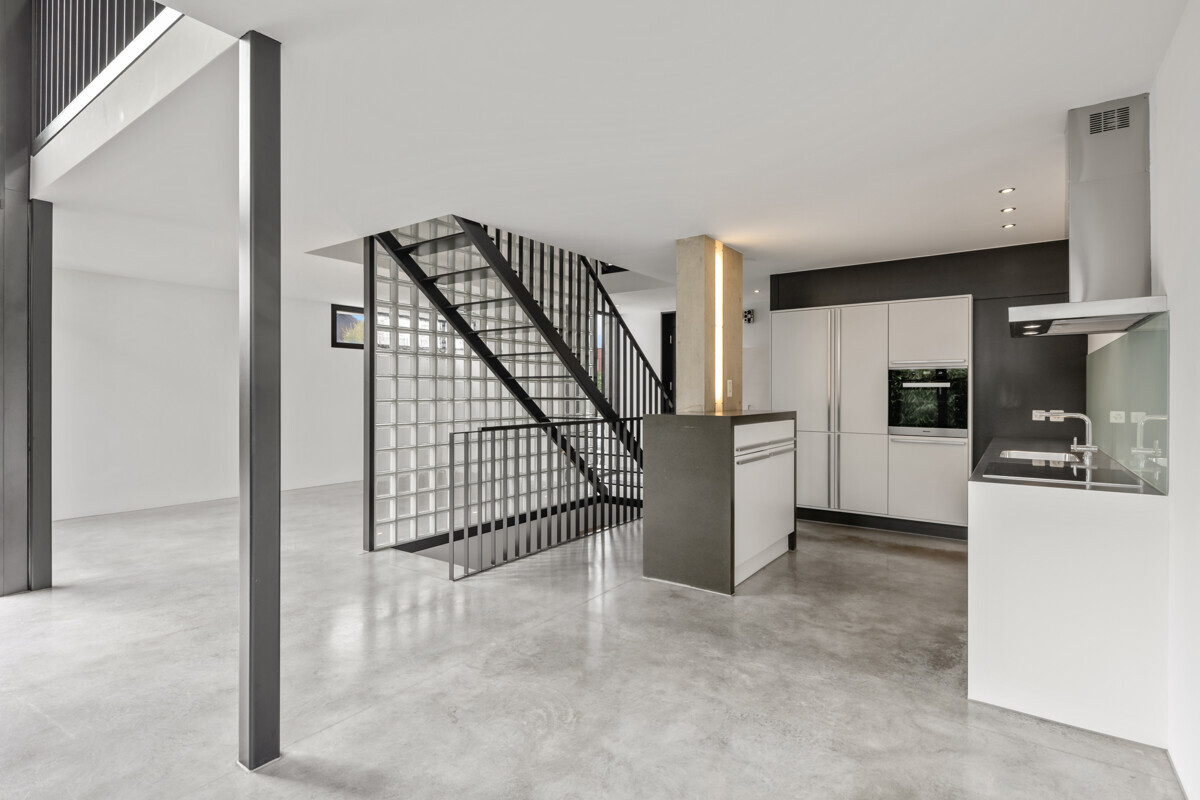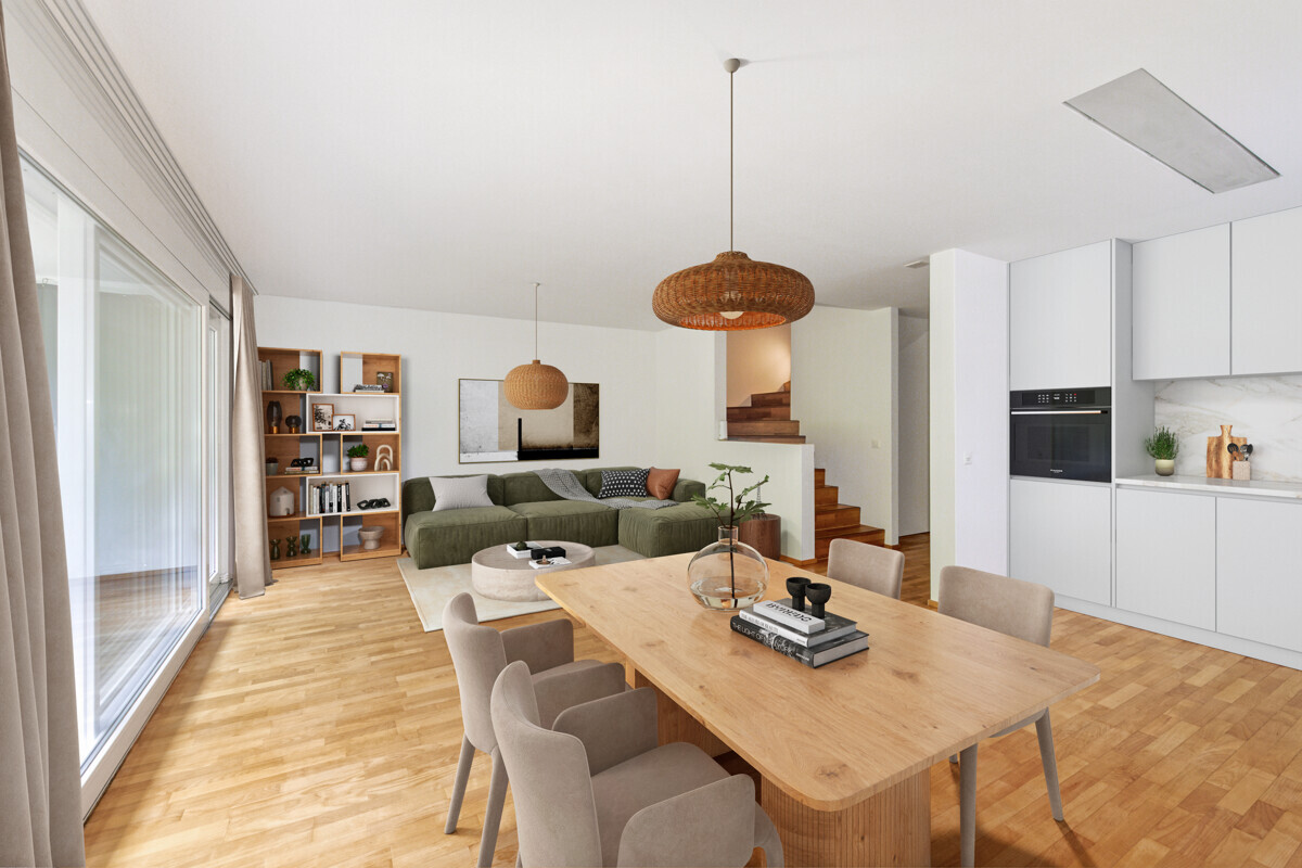 Diese moderne Doppelhaushälfte, entworfen vom renommierten Architekturbüro Arndt Geiger Hermann, vereint grosszügiges Wohnen mit hochwertiger Architektur und durchdachtem Design. Auf 257 Quadratmetern Wohnfläche, verteilt auf vier Etagen, entsteht ein harmonisches Zusammenspiel aus Licht, Raum und Eleganz. Grosse Fensterflächen und hohe Decken schaffen eine luftige Atmosphäre und verbinden den Innenraum fliessend mit dem Aussenbereich. Das Herzstück des Hauses ist der offene Wohn- und Essbereich mit Cheminée, der für gemütliche Stunden sorgt. Ergänzt wird er durch eine exklusive Bulthaup-Küche mit klarer Linienführung und hochwertigen Geräten.