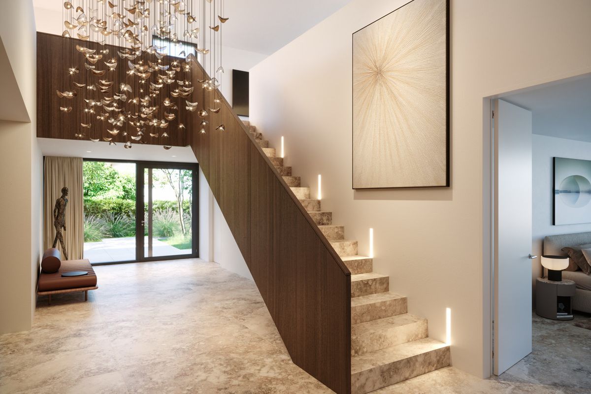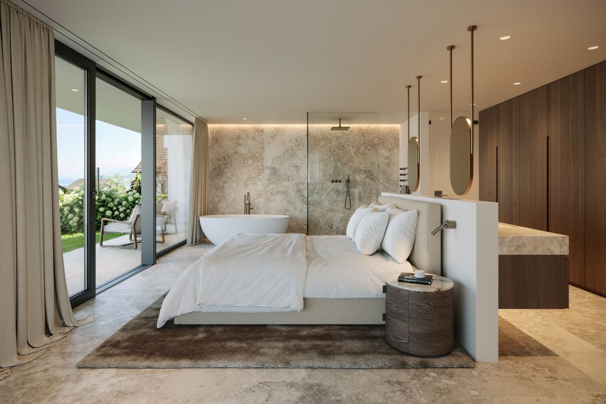 Die private Mastersuite im Erdgeschoss vereint Ankleide, Bad ensuite und direkten Zugang zum Garten – ein Rückzugsort von seltener Qualität. Über den privaten Lift ist Nox direkt mit der geschlossenen Garage verbunden. Privatsphäre beginnt hier beim Ankommen.