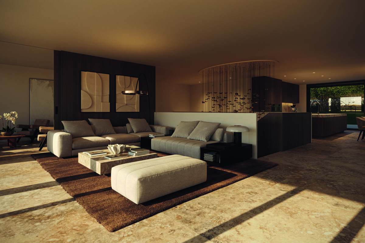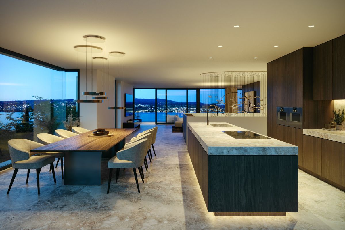 Der Wohnbereich inszeniert sich offen und zugleich privat. Edle Materialien, harmonische Farbwelten und eine klare Architektursprache schaffen eine Atmosphäre von zeitloser Ruhe. Grosszügige Aussenbereiche erweitern den Raum ins Freie – mit Blick auf den Zürichsee, dessen wechselndes Licht jeden Moment neu erzählt.