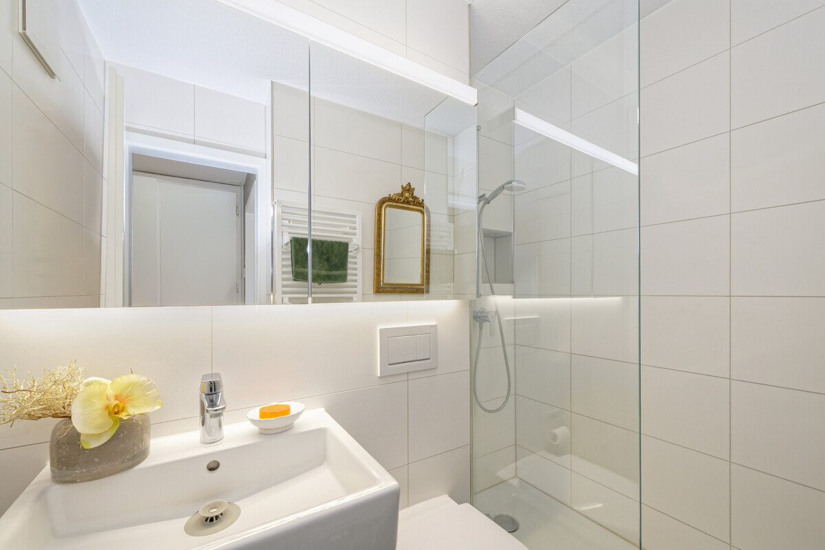 Die funktional ausgestattete Küche schafft Platz für einen Essbereich. Dank der Schiebetüre lässt sich dieser Bereich bei Bedarf abtrennen – eine praktische Lösung, die sowohl Offenheit als auch Rückzug ermöglicht. Die Küche präsentiert sich gepflegt im Originalzustand, während das Badezimmer 2020 vollständig saniert wurde und mit zeitgemässer Ausstattung überzeugt.