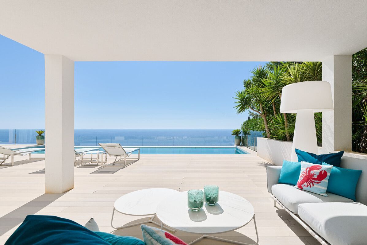 Der Aussenbereich punktet mit einem Infinity-Pool, der ins Meer überzugehen scheint, sowie mit mehreren Terrassen, die zum Sonnenbaden, Essen oder Entspannen einladen. Zwei Stellplätze und ein Doppelgrundstück mit zusätzlichem Bebauungspotenzial runden das Angebot ab.