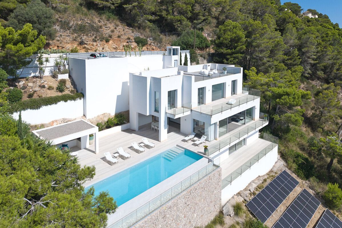 Diese moderne Villa thront über der Bucht von Canyamel in erhöhter Lage mit unverbaubarem Meerblick aus jedem Zimmer.