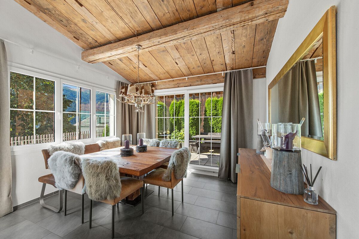 Die Hauptwohnung erstreckt sich über zwei Etagen und überzeugt mit einem durchdachten Grundriss. Drei individuell nutzbare Zimmer, ein grosszügiger Wohnbereich sowie ein modernes Badezimmer mit Badewanne, Dusche und Fenster bieten viel Platz und Komfort. Ein besonderes Highlight ist der stilvolle Esszimmer-Anbau, der 2003 im Rahmen der umfassenden Sanierung realisiert wurde. Die Verkleidung mit Altholz aus einem ehemaligen Stall verleiht dem Wohnbereich eine warme, charaktervolle Ausstrahlung. Die angrenzende Küche ist funktional ausgestattet mit Glaskeramikkochfeld, Backofen, Steamer, Geschirrspüler, Kühlschrank und Weinkühlschrank.