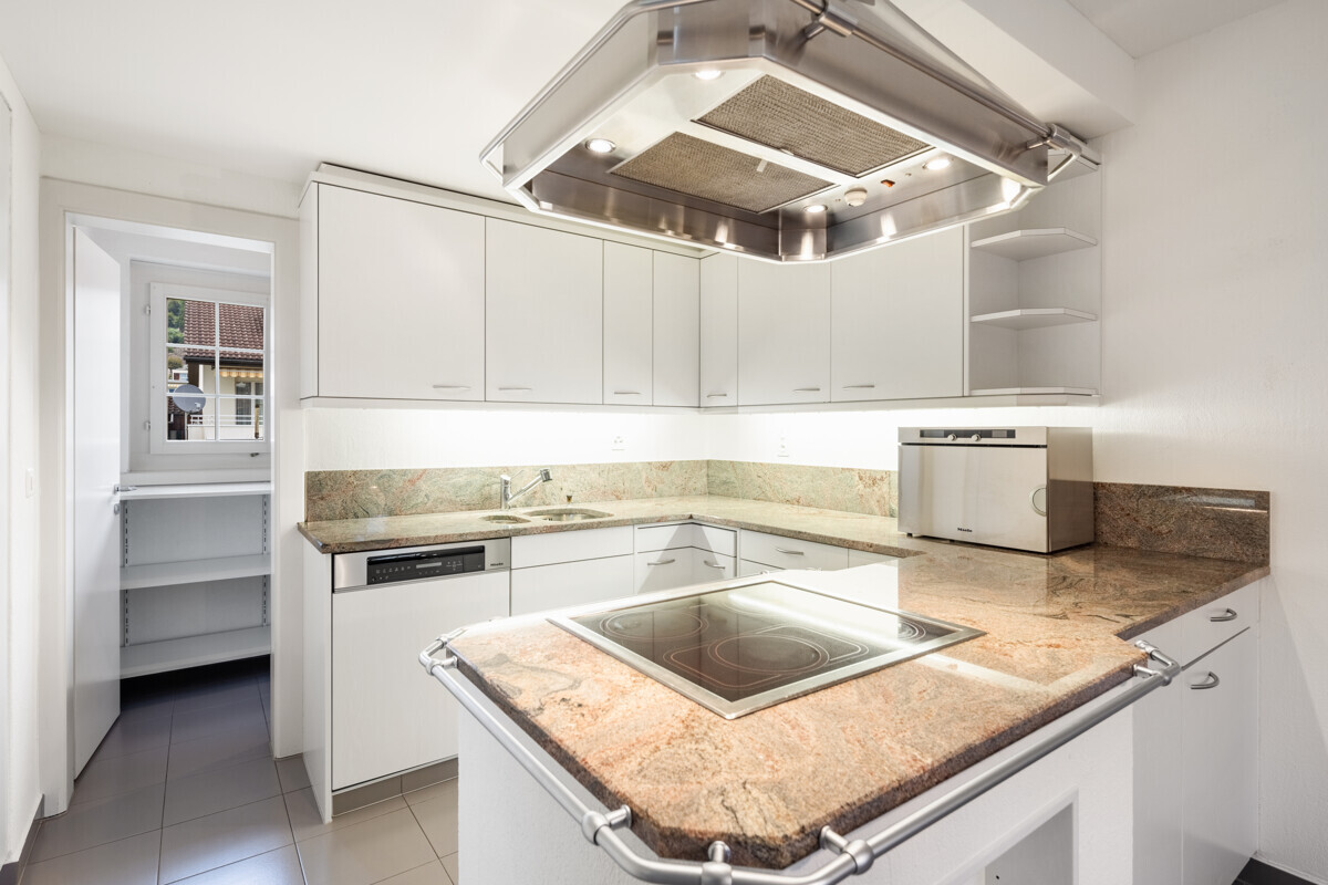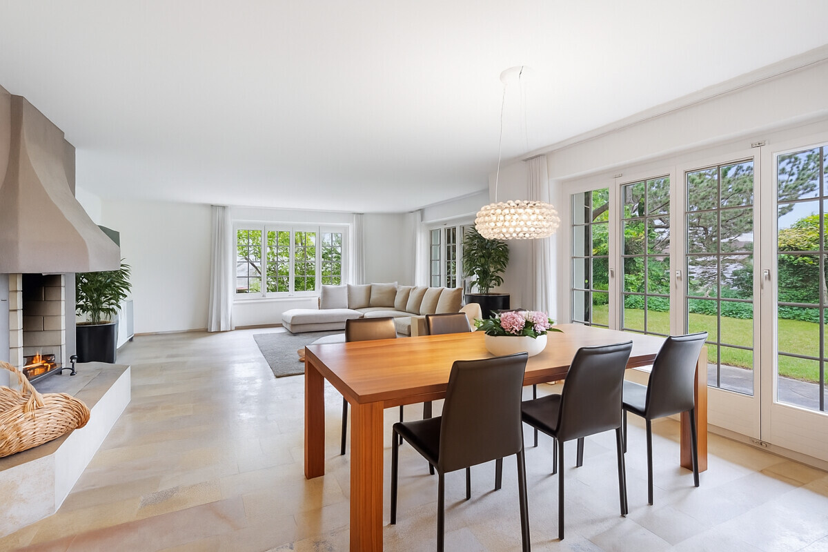 Der einladende Wohnbereich besticht durch grosszügige Fensterflächen und einem Cheminée, das für eine behagliche Atmosphäre sorgt. Ein besonderes Highlight ist der verglaste Wintergarten mit einem weiteren Cheminée, der den Wohnraum optimal erweitert und dazu einlädt, gemütliche Stunden mit der Familie zu verbringen. Die angrenzende Küche bietet ein praktisches Reduit und eine gemütliche Sitznische.