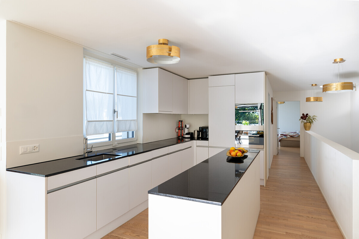 Die offen in den Wohnbereich integrierte Küche ist mit weissen Fronten, einer dunklen Granitabdeckung und hochwertigen Geräten ausgestattet. Zwei stilvolle Badezimmer sowie eine separate Gästetoilette unterstreichen den zeitlosen Ausbaustandard. Drei Schlafzimmer verteilen sich über beide Ebenen und bieten vielfältige Nutzungsmöglichkeiten für Paare oder Familien mit Platzbedarf.