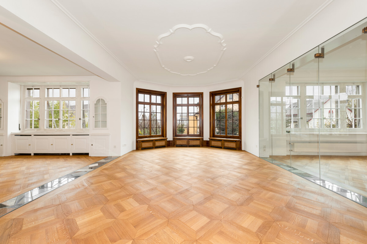 - Large living / dining area with high ceilings and beautiful, partly original floor coverings