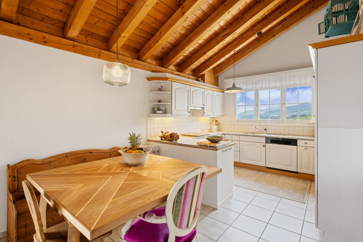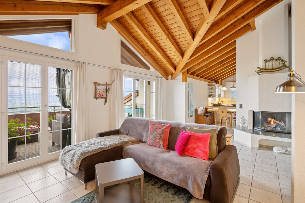 The high ceilings with exposed wooden beams create an open, warm ambiance that invites relaxation. A fireplace in the living area provides cozy moments, while the terrace with unobstructed valley views stretching to Lake Zurich makes every day a special experience.