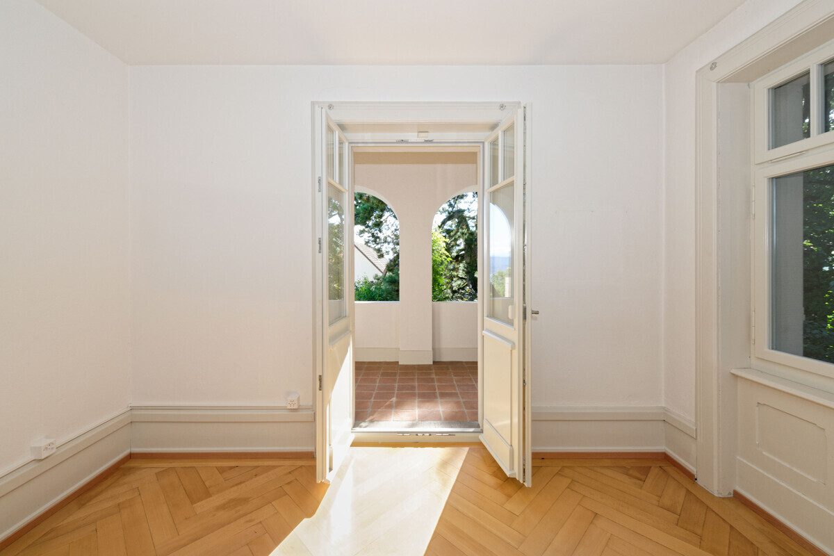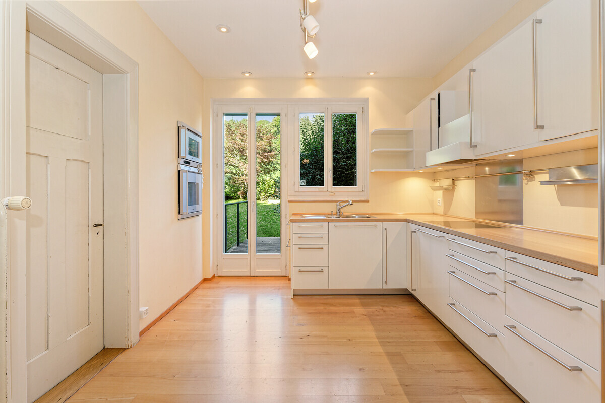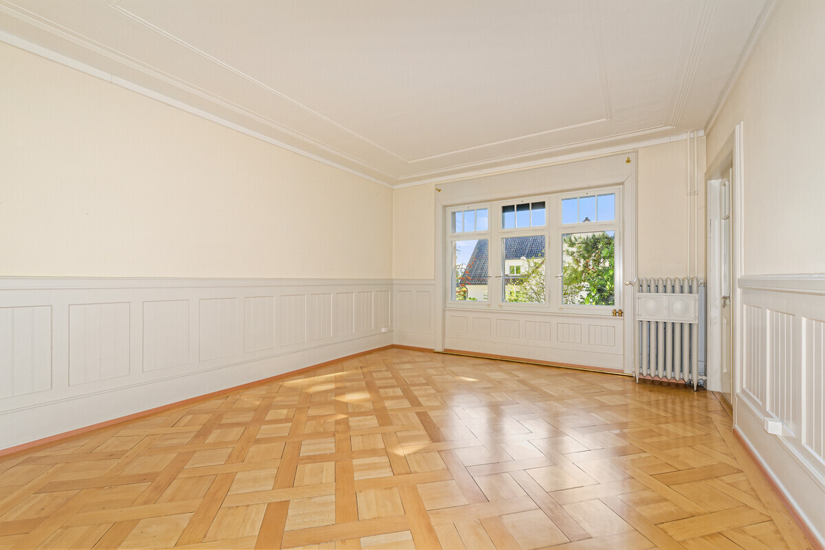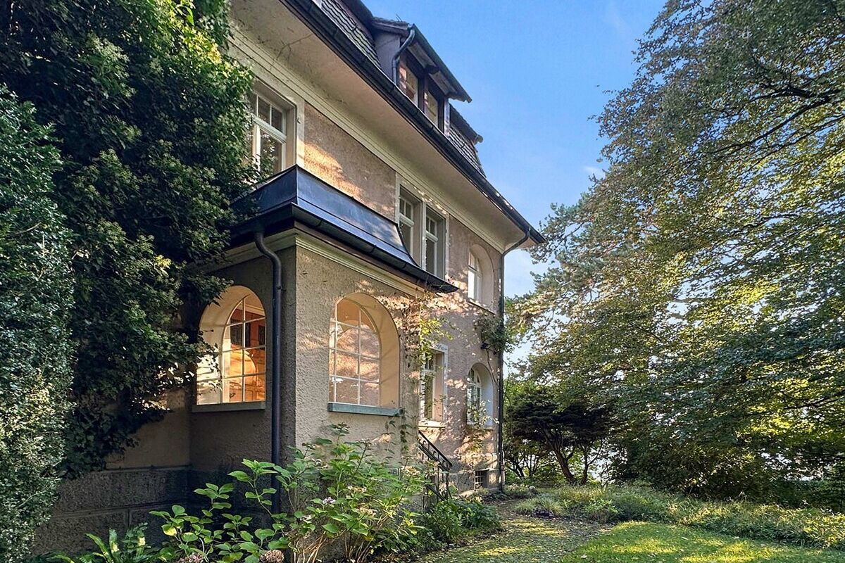 Set on the Zurichberg, directly adjoining agricultural land and the non-developable zone, this semi-detached villa occupies one of the most sought-after sites in Zurich. Benefitting from an elevated position, views extend right down to the lake. The surroundings are quiet, close to greenbelt, and in an established residential district. Nearby woodlands are within walking distance, yet the city centre is still quickly reached – a rare combination of leafy escape and urban proximity.