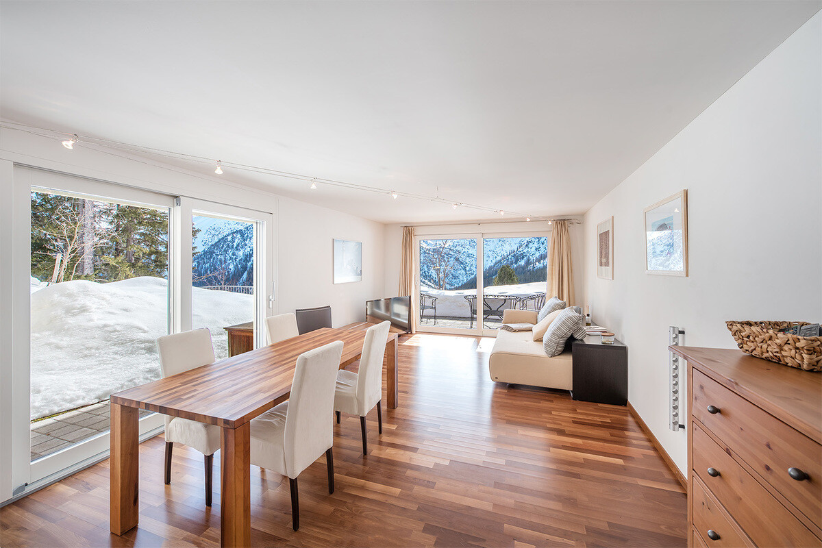Die schönen und hellen Räume laden dazu ein, die Seele nach einem Tag auf der Piste oder beim Wandern genussvoll baumeln zu lassen. Ob im grosszügigen Wohn- und Essbereich oder dem sich durch seine fünfeckige Form auszeichnende Schlafzimmer, die beide über raumhohe Fenster, elegante Parkettboden und eigene Zugänge zum Aussenbereich verfügen, erlebt man überall das schöne Gefühl, an einem Ort von besonderer Qualität zu sein. Diese zeigt sich auch im praktischen Bad, der stilvollen Küche mit eigenem Waschturm und dem kompakten und raffinierten Grundriss mit integriertem Keller: Hier macht man Ferien und verbringt die Zeit nicht mit endlosem Putzen. Besondere Freude stellt sich am Morgen ein, wenn die Sonne auf die gedeckte Terrasse und den eigenen kleinen Garten scheint und man beim Frühstück den Blick auf die Berge geniesst.