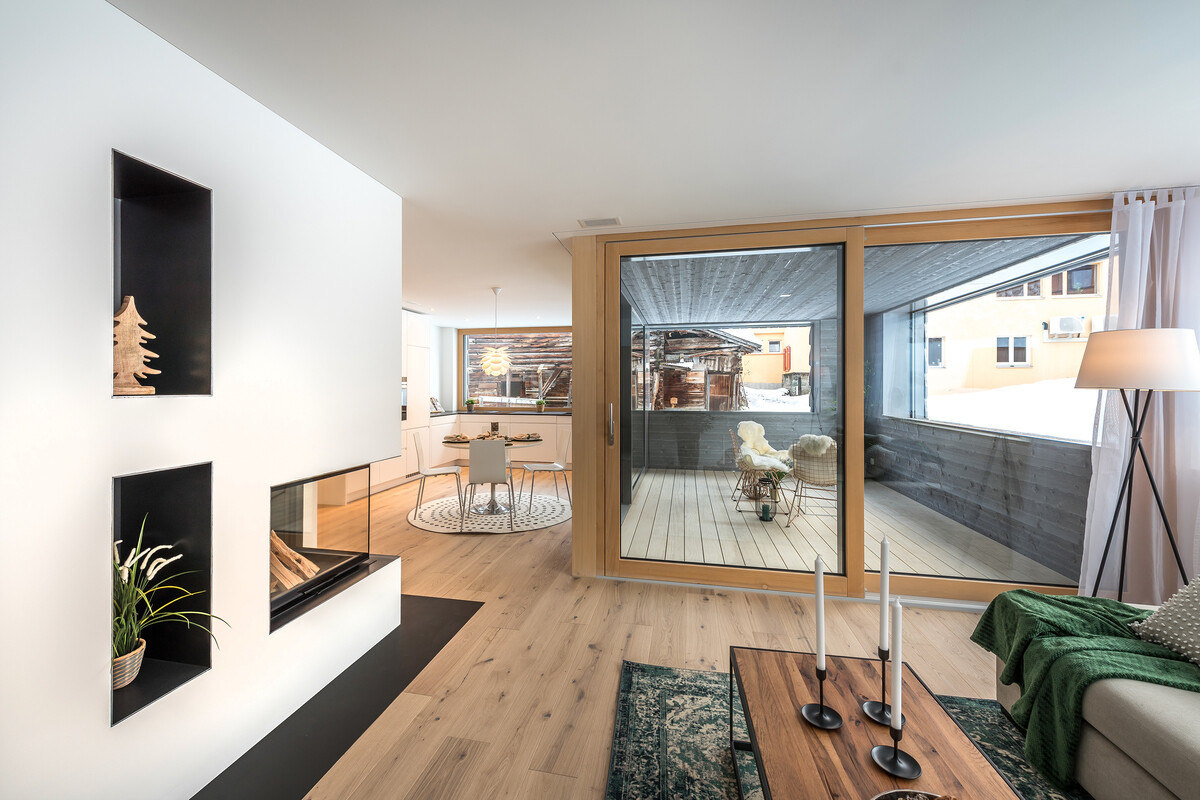 Die individuell gehaltenen Holzfassaden schmiegen sich einmalig in die prächtige Bergwelt ein und betonen die Harmonie zwischen der modernen Architektur und der umliegenden Natur, welche durch die Minergie-Bauweise noch unterstrichen wird.