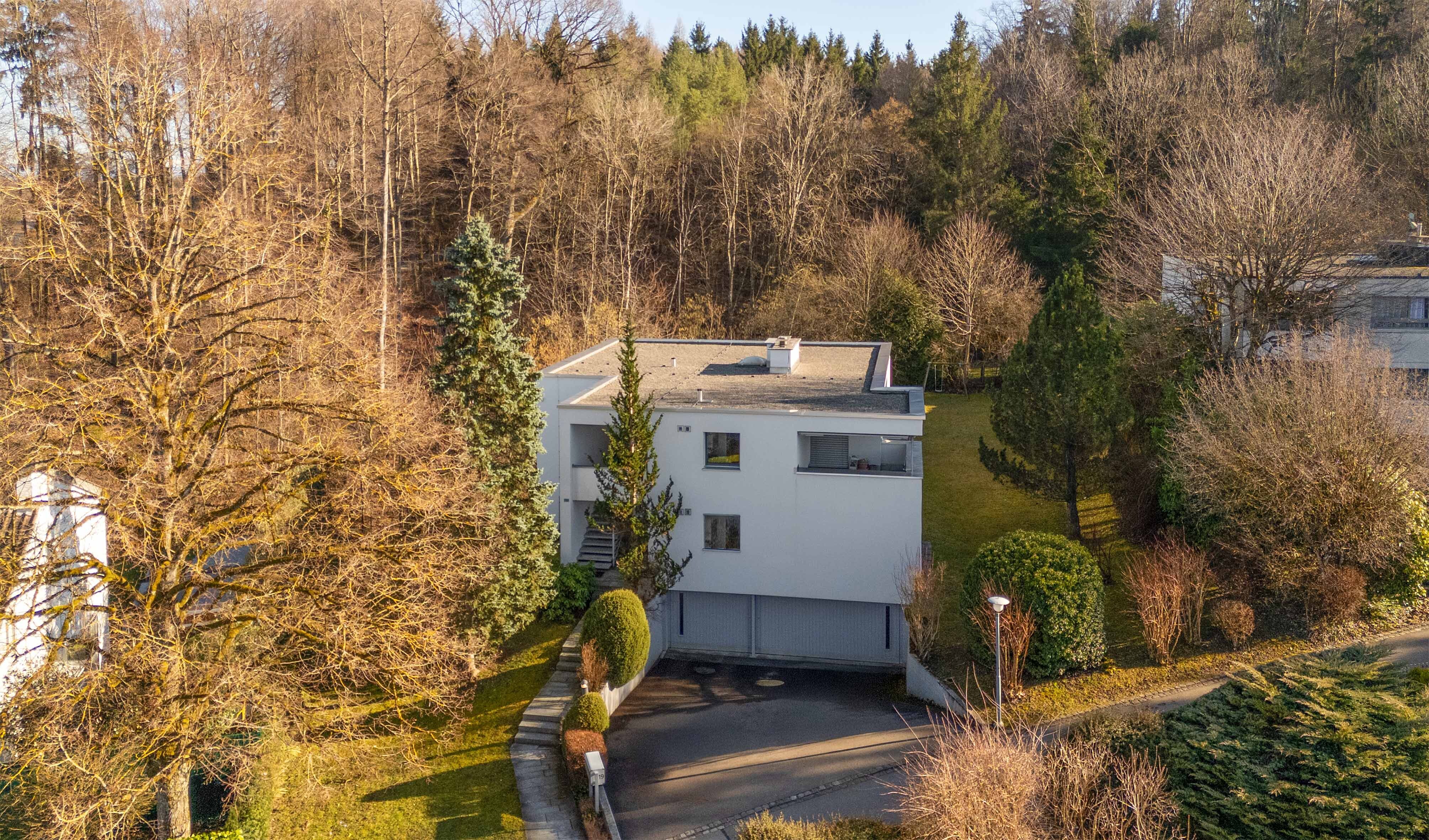 Die leichte Hanglage am Waldrand schafft viel Privatsphäre und eine wohltuende, naturnahe Atmosphäre. Gut ausgebaute Spazierwege und die unmittelbare Nähe zum Grünraum prägen den Alltag, während Zürich gleichzeitig in komfortabler Distanz bleibt und die Innenstadt auch mit dem öffentlichen Verkehr rasch erreichbar ist.