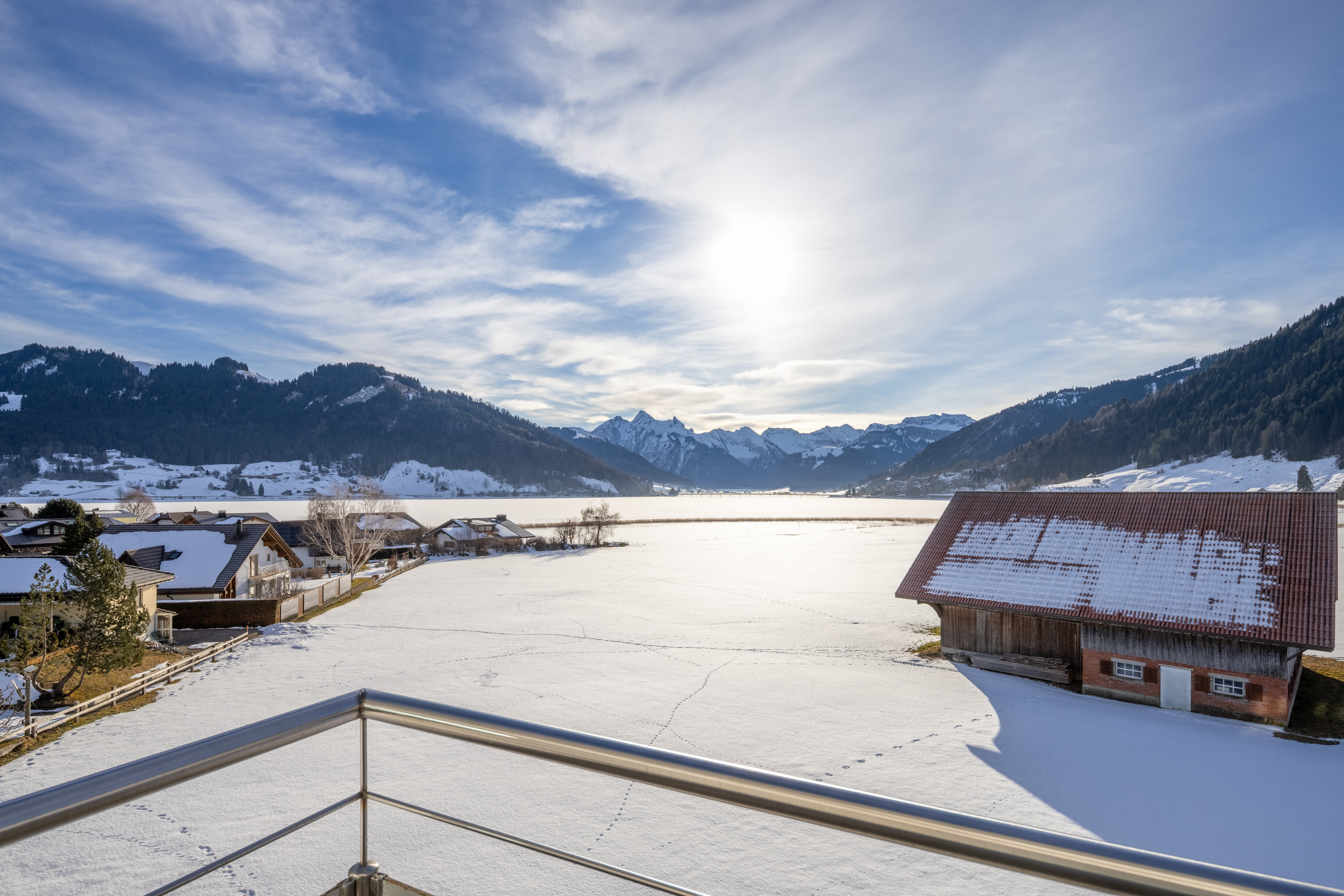 [objektbeschreibung] => Nur wenige Meter vom Sihlsee entfernt und direkt an die Landwirtschaftszone angrenzend, präsentiert sich diese smarte Dachgeschosswohnung in einem gepflegten Mehrfamilienhaus mit nur vier Parteien in Gross SZ. Vom Balkon eröffnet sich ein weiter, unverbaubarer Blick über das glitzernde Wasser und die grünen Weiten der imposanten Landschaft mit Bergpanorama – eine seltene Lage, die Ruhe und einzigartigen Charakter vereint. Im Herzen überzeugt die Wohnung dank raumhohen Fenstern mit viel Licht sowie dem einladenden Wohn- und Essbereich mit der offenen Küche sowie direktem Zugang zum Balkon, wo jeder Sonnenaufgang zum Erlebnis wird. Im Innern entsteht ein besonders luftiges Raumgefühl durch die überhohen Decken mit bis zu vier Metern Höhe.