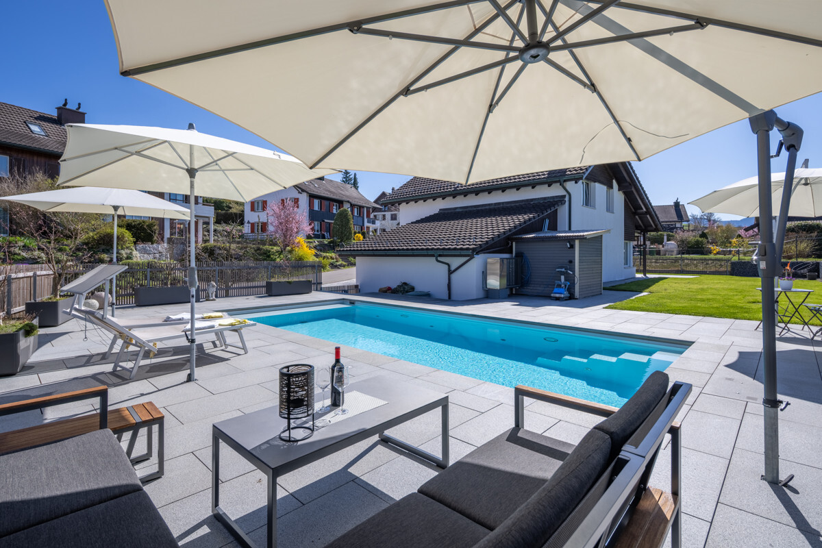 Der Aussenbereich mit Garten, Pool und gedecktem Sitzplatz lädt zur Erholung ein.