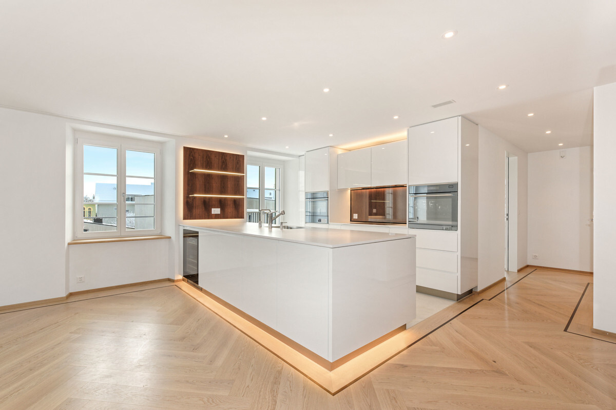 Dank der cleveren Aufteilung auf zwei Ebenen bietet die Wohnung viel Licht und Raum. Die Einbauschränke und begehbare Garderobe, die grosszügige Küche mit Food-Center und Weinkühler sowie der direkte Zugang mit dem Lift sind weitere spannende Highlights.