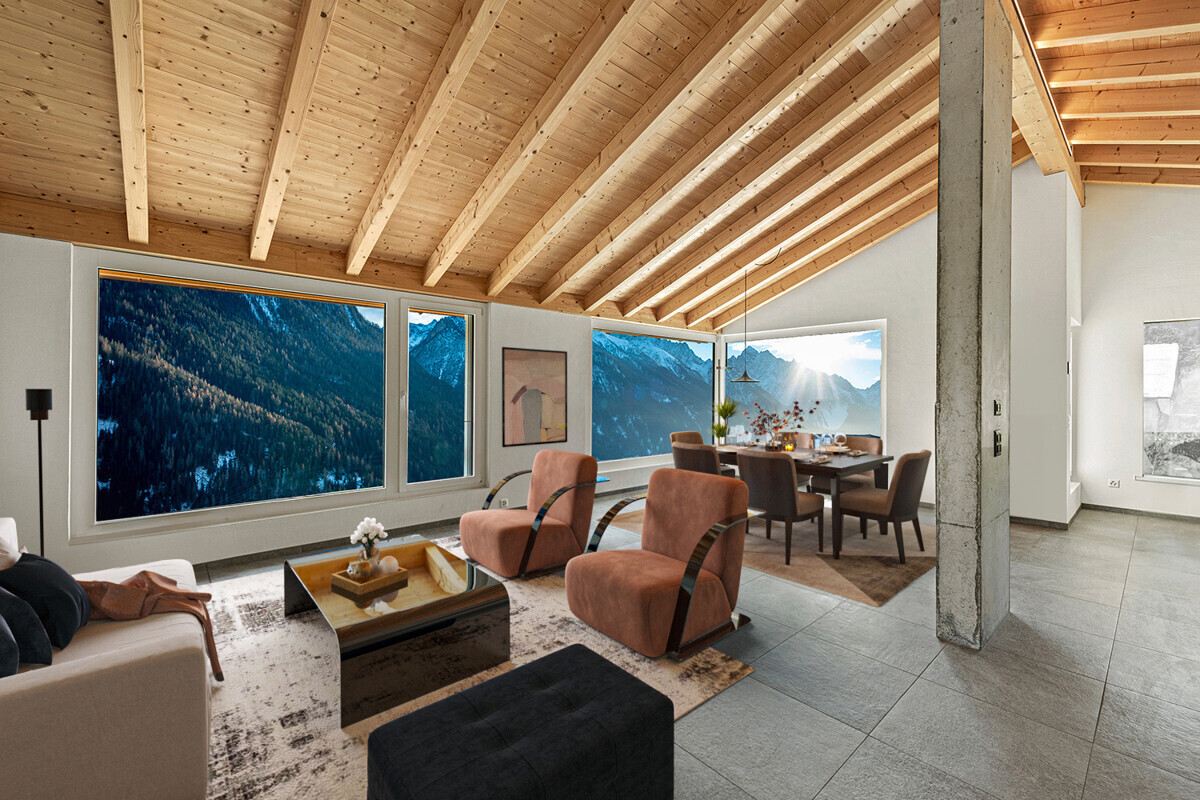 [objektbeschreibung] => Das im Jahr 2023 fertiggestellte Einfamilienhaus besticht durch seine moderne Architektur und hochwertige Ausstattung. Sorgfältig ausgewählte Materialien und die neuesten technischen Installationen gewährleisten eine komfortable und nachhaltige Lebensweise. Die Wohnfläche von 210 Quadratmetern ist clever aufgeteilt. Drei Schlafzimmer und zwei voll ausgestattete Badezimmer bieten ausreichend Platz und Privatsphäre für alle Bewohner. Durch die grossflächigen Fenster wird jeder Raum mit natürlichem Licht durchflutet und bietet zugleich einen spektakulären Blick auf die umliegende Berglandschaft. Die Materialwahl im Innenbereich unterstreicht den Anspruch an Qualität und Ästhetik.