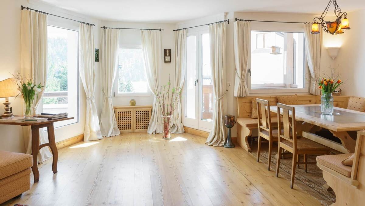 Die sonnige Wohnung präsentiert traditionelle Elemente wie die Küche mit ihren schönen Altholzelementen und einem prächtigen Bartresen in filigraner Holzarbeit; im hellen Wohn- und Essraum schaffen die eingebaute Sitzecke aus Arvenholz und das Cheminée im Eck urige Gemütlichkeit. Zugleich ist die Einheit modern, geräumig und sehr komfortabel. Zum grossen Schlafzimmer kommt ein modernes Bad; der zweite Schlafraum mit Bad ensuite, traumhafter Aussicht und eigenem Eingang eignet sich auch für Gäste.
