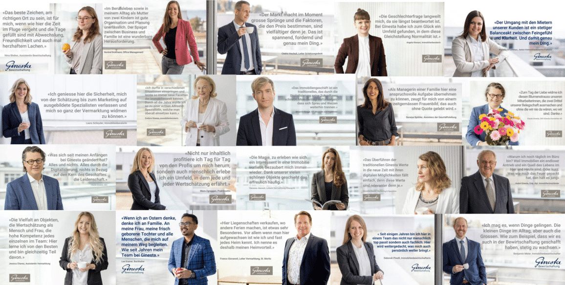 Ein Blick hinter die Kulissen Wichtigstes Kapital einer Dienstleistungsfirma, wie wir es sind, sind die Menschen. Einige von uns sind häufig unterwegs zu Schätzungen, Besichtigungen oder Wohnungsübergaben, andere arbeiten im Hintergrund dafür, damit wir von A bis Z einen Topservice anbieten können. Mit unserer Social Media Kampagne wollen wir allen ein Gesicht geben und zeigen, dass wir in unserer Rolle als Vermittler und Bewirtschafter von Lebensräumen alles daran setzen, auch für unsere Mitarbeitenden einen Raum zu schaffen, in dem sie sich wohl und wertgeschätzt fühlen.