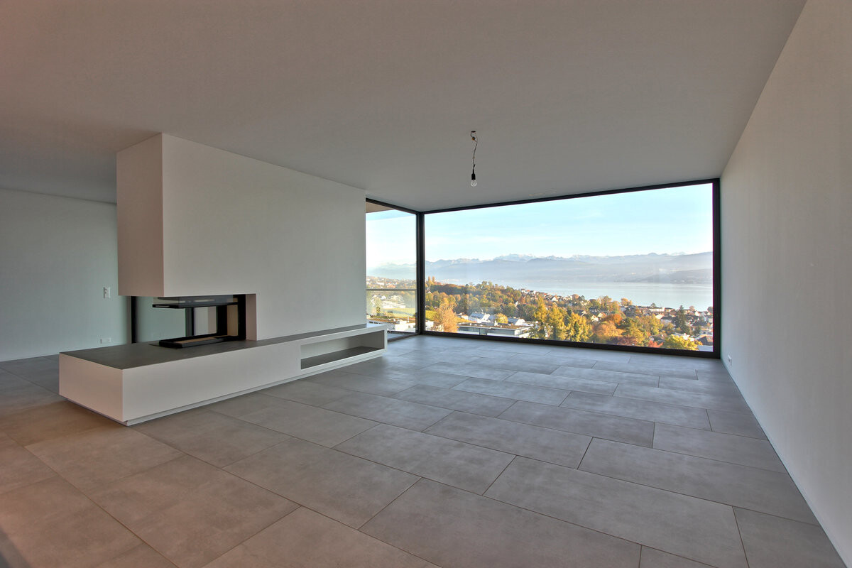 [objektbeschreibung] => Elegantemente distribuite su due soli piani, le case a schiera presentano layout luminosi, ciascuno con 250 metri quadrati di spazio abitativo e 6 ½ camere, oltre a spaziose stanze adiacenti. Il piano d'ingresso e di soggiorno, con un'altezza di 2,70 metri, si trova al livello superiore e comprende la zona giorno/pranzo a pianta aperta con magnifica vista sul lago e sulle montagne, un moderno camino, una cucina a pianta aperta e l'accesso alla loggia riparata, oltre a una stanza da giardino che può essere utilizzata come estensione del soggiorno, come camera da letto o come camera da letto con accesso al patio e un ampio bagno. La toilette per gli ospiti nell'ingresso e due bagni offrono un pratico comfort abitativo.